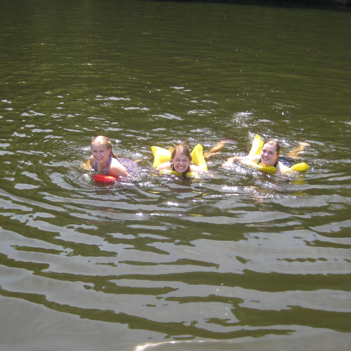 Wednesday (Day 4): Half-day of work! Every year, Wednesday is when we get the afternoon off to do an activity and eat out for dinner. That morning of work, my sisters, Briana and Emma, along with a friend, and I dumped out old paint onto scrap carpets, and the paint swirled around so lovely. We even marble-dipped some rocks in the paint, which turned out beautiful. That afternoon, we went on a pontoon boat, one of the most significant highlights of the trip. Emma, a friend, and I swam in the water and pretended we were on a survival show called ‘Girl Beat the Wilderness.’ We acted as if there were water mocassins and sharks in the water and even found a highlighted area of the water where I ‘performed’ Country Roads for the audience (a.k.a. Emma and my friend). We ate at Texas Roadhouse for dinner that evening, where we all ate way too much food; I couldn’t even finish mine. We were making each other crack up, and I felt like I would puke because of all the food I ate. Even better, someone told the waiters/waitresses that my birthday was coming up, so they made a big show about it and called me out in front of the restaurant. When we got back to camp, we played more volleyball and even listened to some ‘oldies’ music through my speaker.