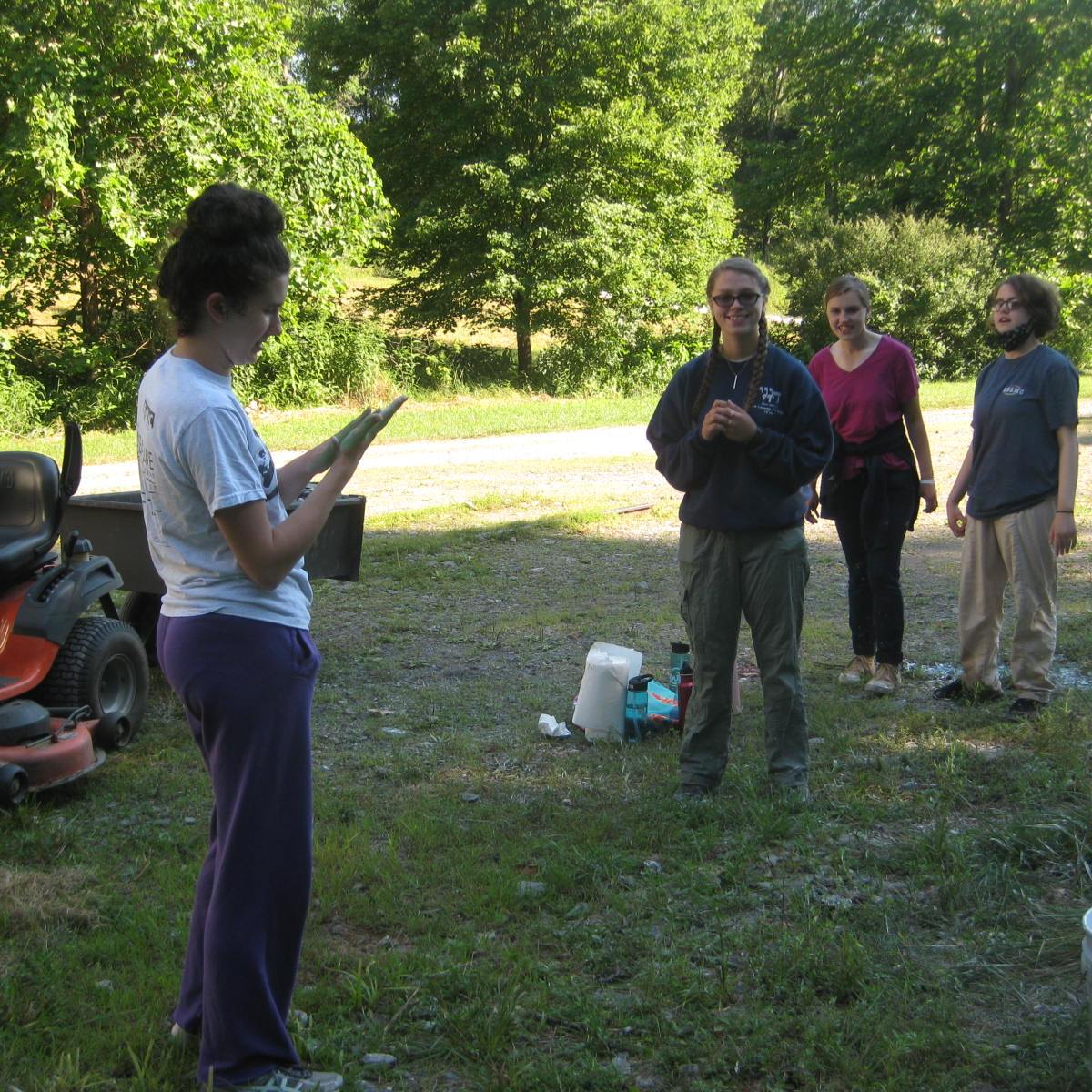 Monday (Day 2): First day of work! I woke up super early that day, and while I was doing my hair, I sneezed five times in a row! At the site where we were going to work, we had to take down some scaffolding and put up some ladders to paint the side of the house. We were waiting for paint, so we headed over to the other site to fill up water bottles and do some work there. At that site, two other kids and I began to dig a hole for a railing. While digging, I found a big lump of coal! Unfortunately, I left it there, but at least I got a picture. Before we took a lunch break. I was able to ‘cut in’ on the wall that I was going to paint. After lunch, however, it began pouring while we were painting, so we left the site early, at around 3:00. Since we had extra time, we visited a woman we helped a few years ago, which was enjoyable because she’s really funny. That evening, after dinner, my sister, Emma, a friend, and I were mopping floors in the kitchen, and we were apparently not too good at it. The friend who was mopping the floor with my sister and me made a joke “How many Pennsylvanians does it take to mop a floor?” Because it took us forever, and we accidentally mopped all around us until we were stuck in the middle of the room. After worship and our debrief session, two friends, Emma, and I were worried about one of our other friends who had gone into a field to talk on the phone. The four of us decided to look for her but chanced upon the burn pile where worksite scraps were dumped. One friend was lying on a mattress in the pile and, since it was dark out, we took some cursed photos with the flash on (it made his eyes seem to glow or turn red). While cleaning the bathrooms that night, I accidentally inhaled some bleach, which really scared me, but I ended up being fine, obviously.