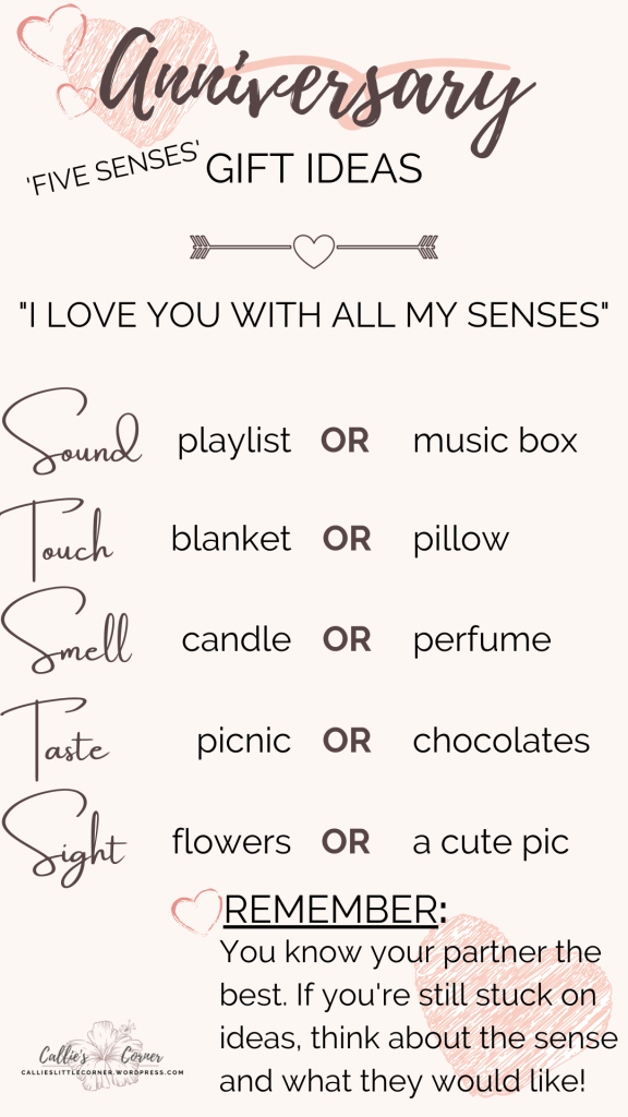 Anyway, I’ve got some more gift ideas for you (along with another cute little graphic!) This time, I’ve made it ‘Anniversary Edition.’ I can’t take credit for this idea, I found it on Pinterest, but I think it is just adorable and definitely worth sharing. I call this gift idea ‘The Five Senses Gift.’ You create a little card that reads ‘I love you with all my senses’ and buy one little gift for each sense. I did this once, and I absolutely loved it!