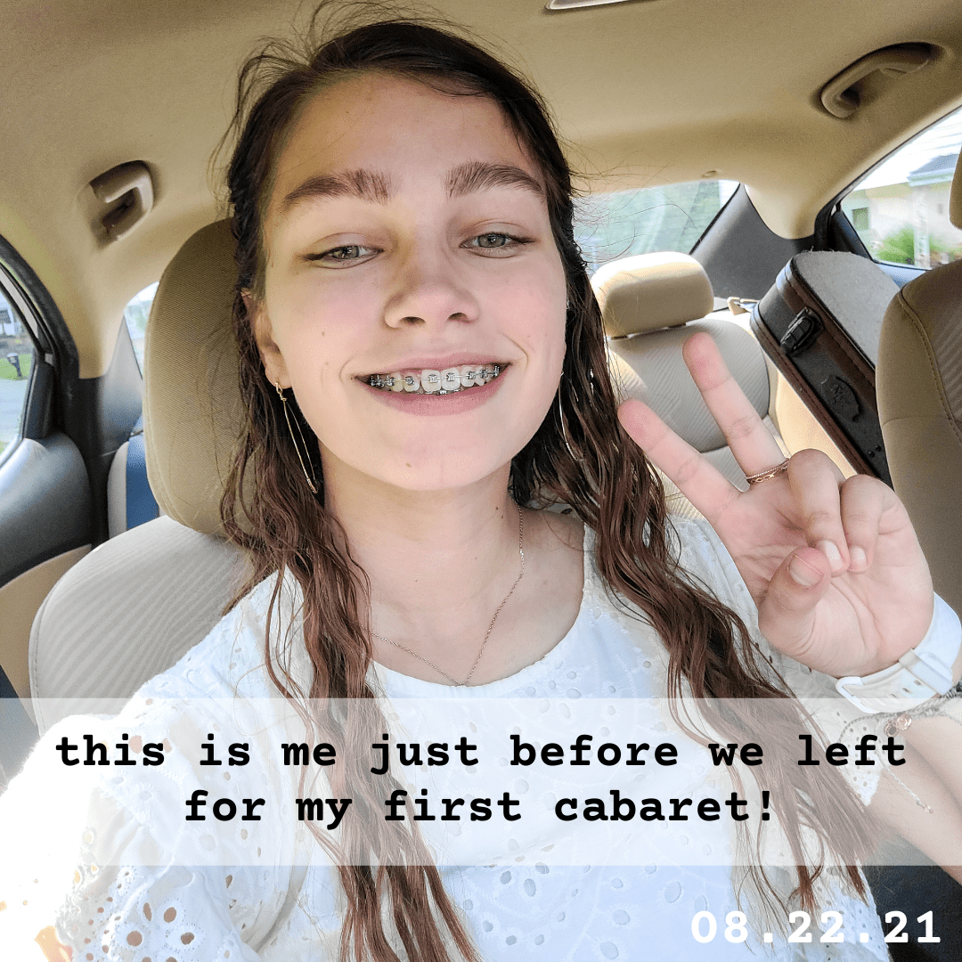 Starting in June, I (along with my sisters) began taking vocal lessons. A few schoolmates had taken lessons with this woman, and we were amazed at their voices, so my mom signed us up, and we started! This woman hosted a cabaret to spotlight each of her students who sing a song. I have never done a cabaret before, and I had just begun vocal lessons, so I was really nervous, especially because I know my voice is pretty subpar. Nonetheless, I had fun, I think I performed okay for my first cabaret, and I’m excited to continue taking lessons.