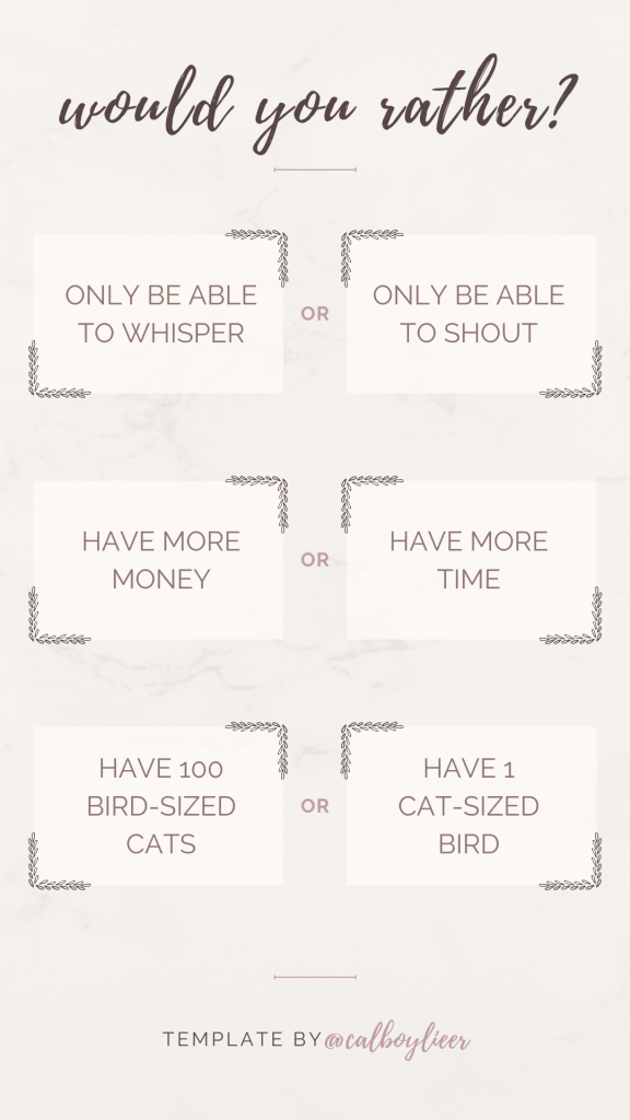 Hello everyone, I hope you’re having a lovely morning/afternoon/evening! If you’re anything like me and you have Instagram, you LOVE doing all those little Instagram story templates. Whether it’s This or That or a fun Get To Know Me sort of thing, I love filling them out!