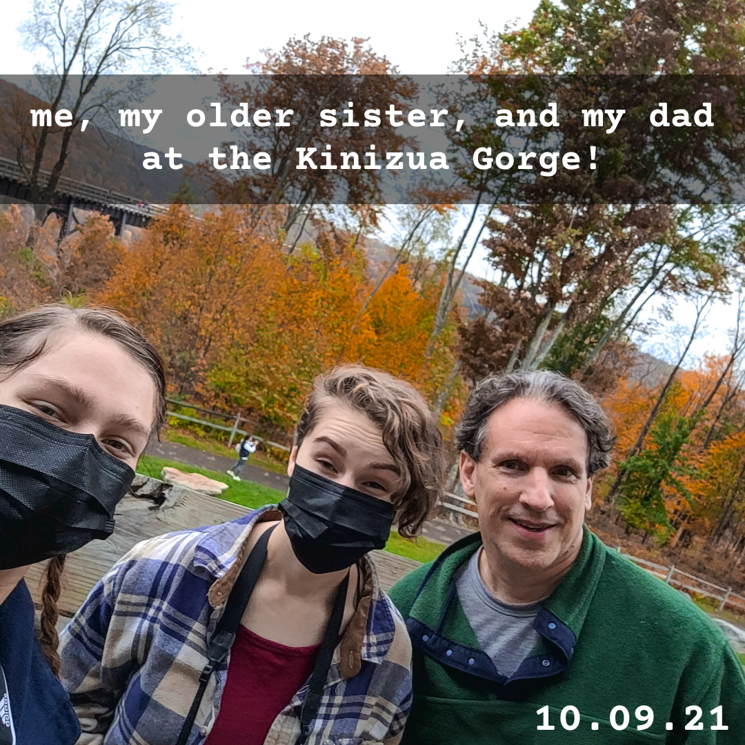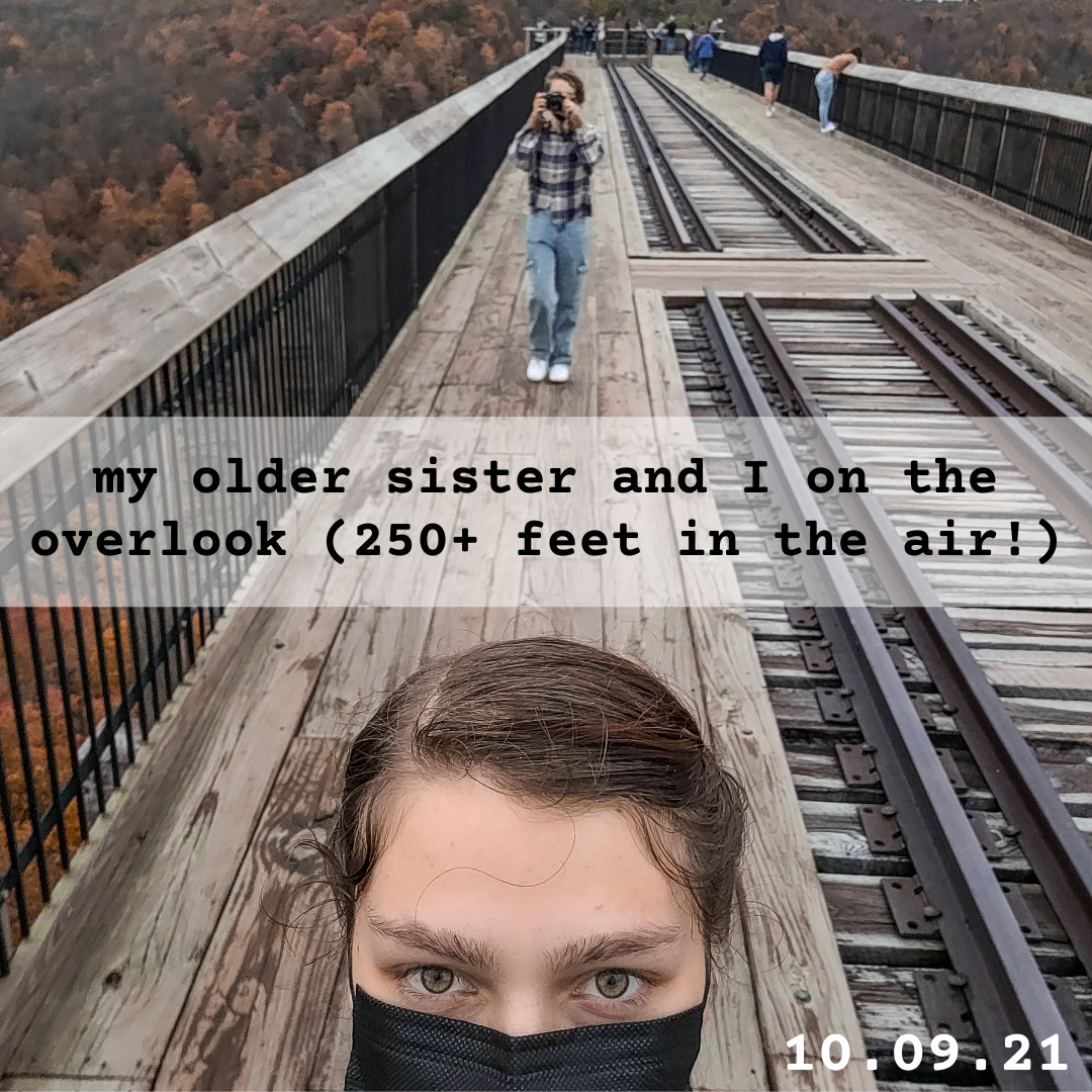 Every year (around August/September), my dad takes my sisters and me camping. My younger sister, Briana, couldn’t make it this year, so it was just my older sister, dad, and I. We stayed at an RV/tent park from Friday to Sunday. We slept in tents at night, then went sightseeing all day. We visited a World War II museum in Eldred, Pennsylvania and the guide was spectacular. He was super encouraging when he learned that I wanted to be an author, and was also really into Girl Power and showed my sister and me a full display and told us stories. We also saw the Kinizua Gorge and went on the overlook about 250+ feet in the air! Overall, I loved camping, and despite the rain and soggy tent, I had so much fun.