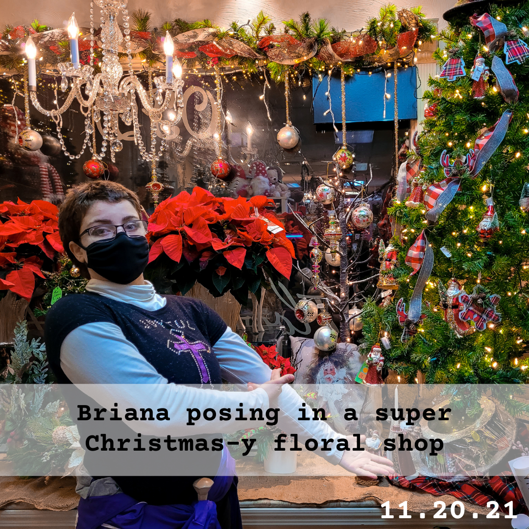 Every year, a town that I live by hosts a Christmas Light-Up Night parade. It’s a quaint little town (that I actually adore), and although the streets are crowded, I really enjoy getting to go down and watch the little parade. My sister, Briana, and my other younger sister were both in the parade twirling baton. But afterward, Briana and I explored the streets a little bit while my family watched my youngest siblings sing Christmas carols with their school. While exploring, Briana and I found a festive courtyard that held entrances to three shops. We went into two of the shops (an antique store and a floral store) and got some silly pictures (accompanied by odd looks from bystanders) around the festive decorations in the courtyard. We thought about going into the expensive-looking jewelry store (it literally had “goldsmith” in the name) but decided against it. I didn’t exactly wanna be confronted by a store clerk asking why two average-looking teenager girls were perusing a lavish jewelry store.