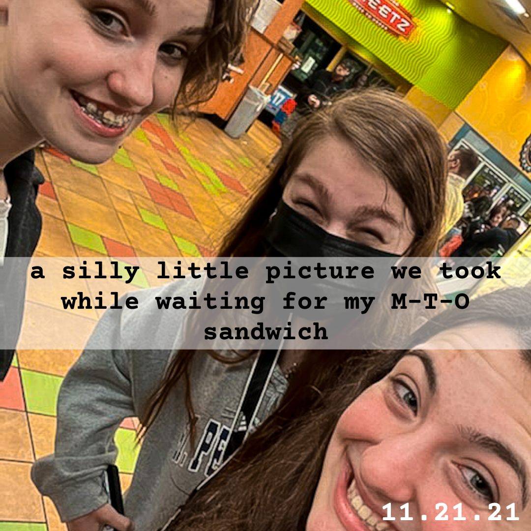 On Monday, November 15th—on our way home from Bible Study—my older sister, best friend, and I were having a little karaoke to Disney, and we decided right then and there that we needed to have a sleepover the next week. Of course, that sleepover had to be full of more Disney karaoke and a late-night Sheetz run. So, over the week, we went back and forth in a group chat and finalized plans for a sleepover! Sure enough, we had more Disney karaoke, we went to Sheetz at eleven o’clock or so at night, and we had a lot of girl talk. I know that sounds stereotypical but lemme tell you, girl talk is essential. The next morning, my older sister had to leave early for work, but I stayed for a bit longer with my best friend, and she introduced me to whipped cream on Eggo waffles for breakfast (it’s amazing, btw). Overall, it was super fun, a needed break, and a great, personal reminder that—though they are few—I do have friends and folks who care about me (and are even willing to be silly with me and belt Disney songs)