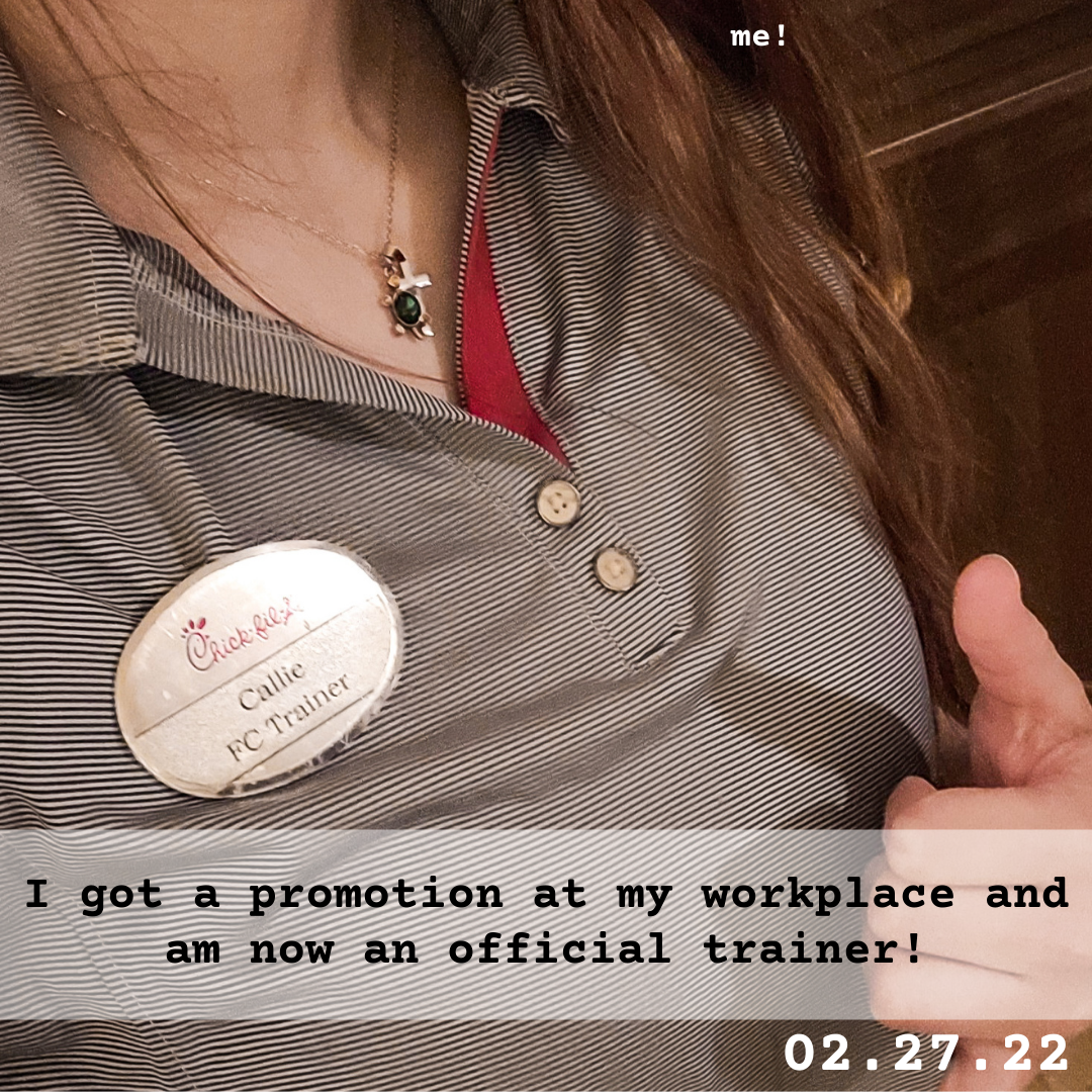 WHO GOT A PROMOTION?? CALLIE GOT A PROMOTION!! I’m finally a trainer at my workplace! I’ve been hoping for this for about a year and a half now and, honestly, would have been a trainer a year ago if I didn’t tear my shoulder 😒. However, even after my shoulder was better, it seemed like every possible obstacle was in my way to becoming a trainer. But, here we are! I’m honestly really excited about this, to lead people and teach/help new employees, and I’m hoping co-workers will finally see me with the respect of someone who’s been working there for nearly three years. Yet, this is a big responsibility, and if I’m gonna fulfill it and live up to it, there is a lot that comes with it. I’m a little nervous about all that. Still, I’m hoping that with the training plan (and materials) that a manager gave us, I’m hoping I can raise and teach successful new employees and get them comfortable situated in this workplace.