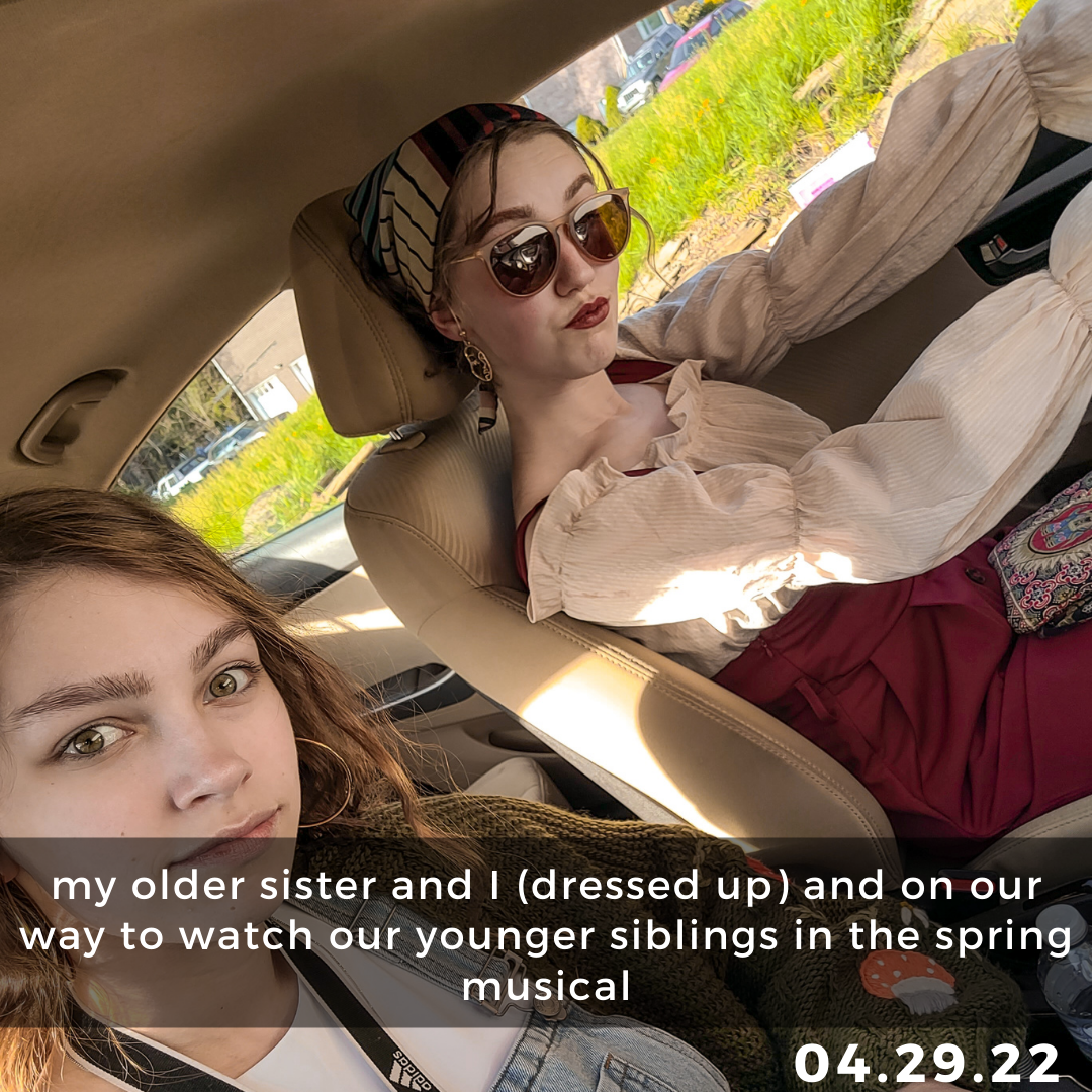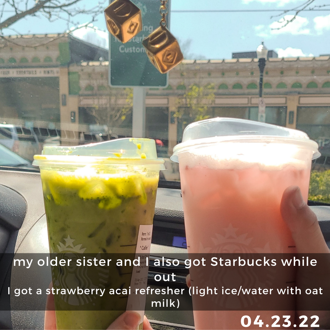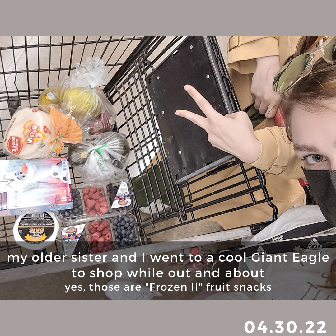 Over the past few weeks, a friend has been mentoring me about social anxiety and overall life. It’s been super helpful, and I enjoy it; however, since my older sister now has her license, she’s been tagging along (‘cuz she’s also my comfort person in social situations). After our chats, the two of us just kinda… explore. We visited a thrift store once, have gone to Starbucks a couple times, and even went grocery shopping at a cool-looking Giant Eagle that was in the area. I just find it so fun. Sadly, I still don’t have my license yet, so it’s not as freeing, but it’s still nice to be able to go places freely when I can.