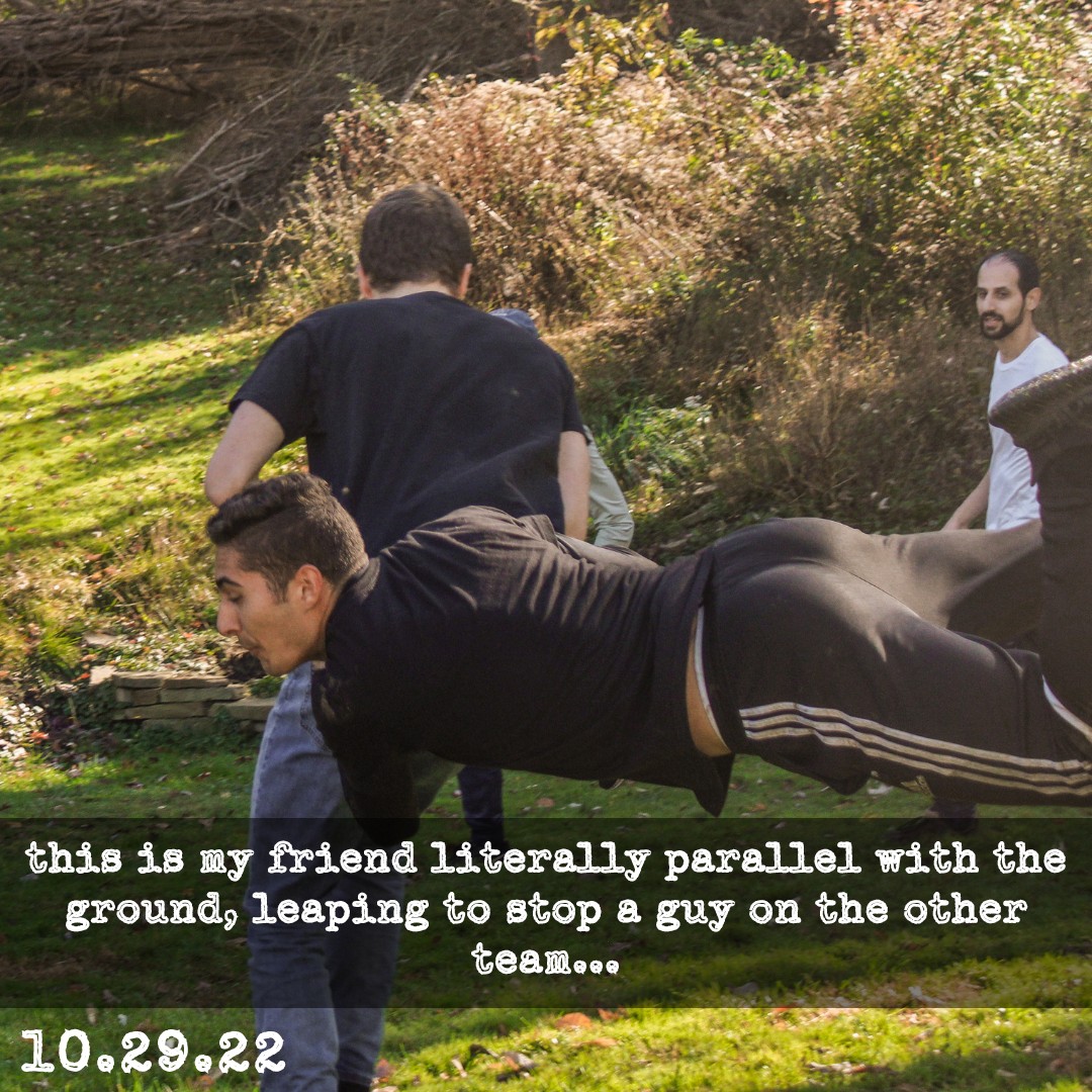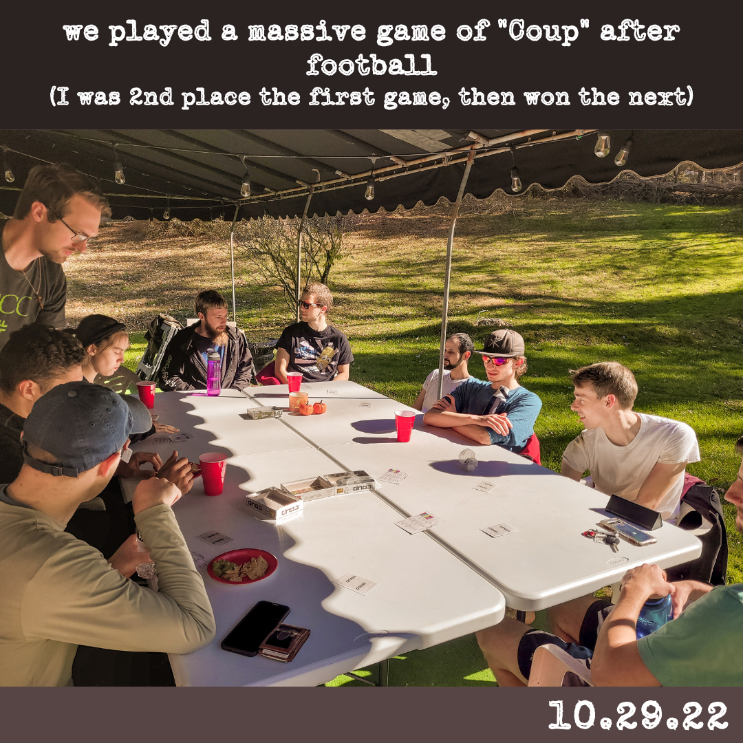 My older sister’s fiancé wanted to play football with our young adult church crew, and my older sister and I hosted it at our house since we have a rather big yard. Nine people ended up coming, excluding my sister and me, and four of my younger siblings played, too (off and on). I was still super sore from backpacking (and am also not much of a sports person), so I decided to grab my camera and take some action shots. I took 635 photos but filtered out the bad, blurry, etc. photos and ended with 230 or so. I put some of my favorites down below in the gallery. They were playing “touch-hand-touch football” or something, meaning instead of tackling or even having flags, you had to touch the person with two hands to “get them out” (idk how to play football; don’t judge my terminology). It ended up being really funny because, in many photos, it looks like the guys are hugging or dancing with each other. After football, we sat down to play a mega game of Coup since we had two decks, and I got second place in the first game, then won the next. It was great. It was a great way to spend the morning, and I had tons of fun despite not even playing football.