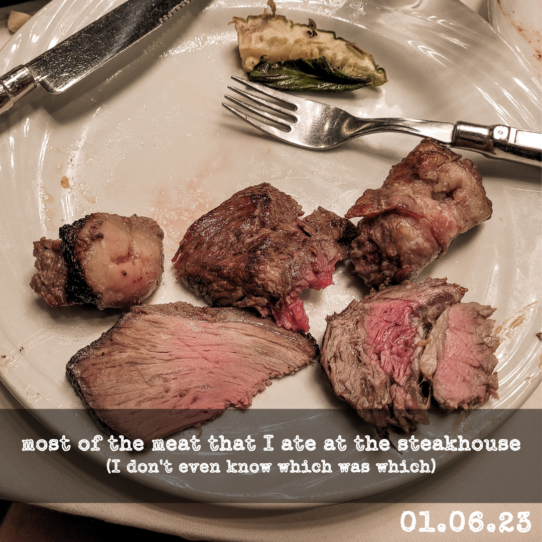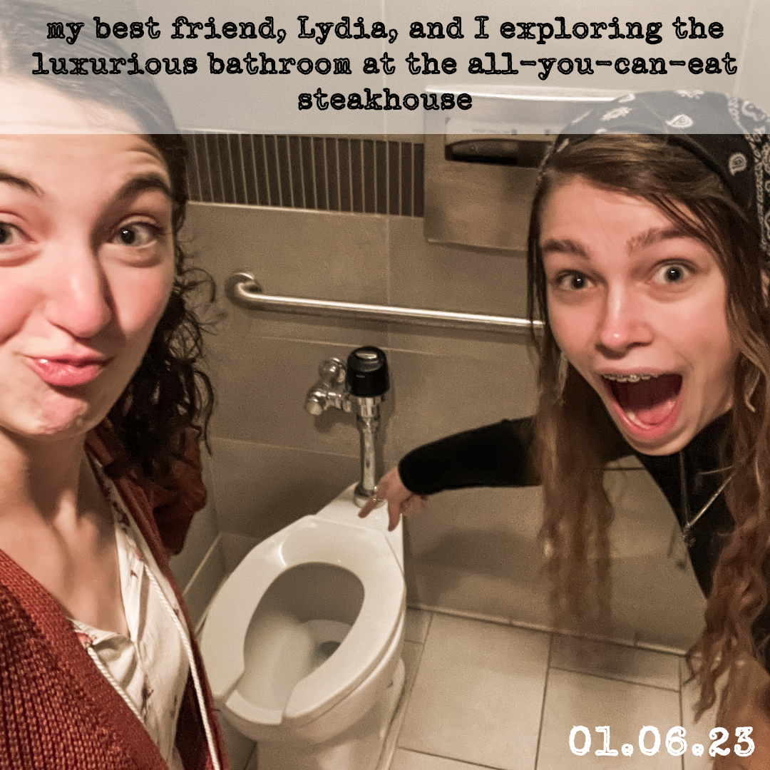 Every now and then, my friend group goes to an all-you-can-eat steakhouse called Fogo de Chão. This was my first time going. We went to the salad bar first, and I tried eggplant for the first time (it was really good!) Then, they began bringing out giant chunks of meat on swords. Well, not swords, but they were very long and sharp skewer things. I don’t remember each individual meat (meat just tastes like meat to me, I don’t know), but there was lamb, sirloin, filet mignon, and some other fancy ones. It was overall a very fun experience, especially when my best friend, Lydia, and I explored the fancy bathroom!