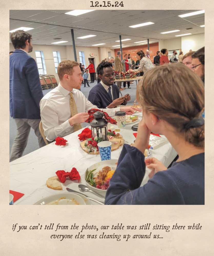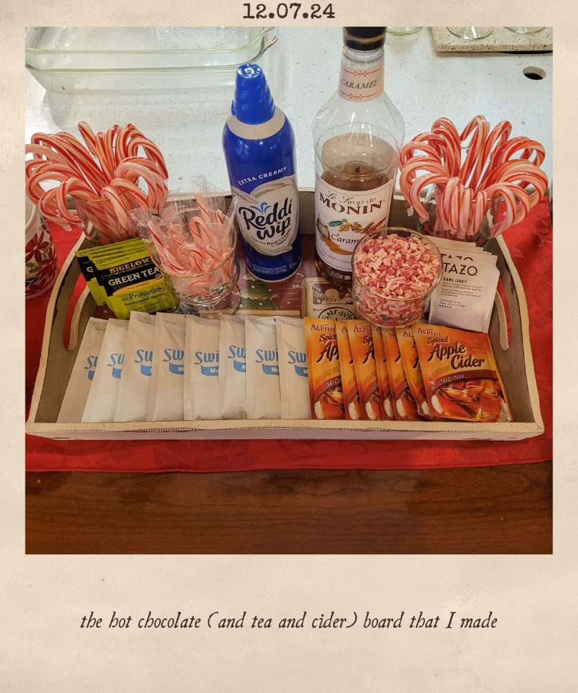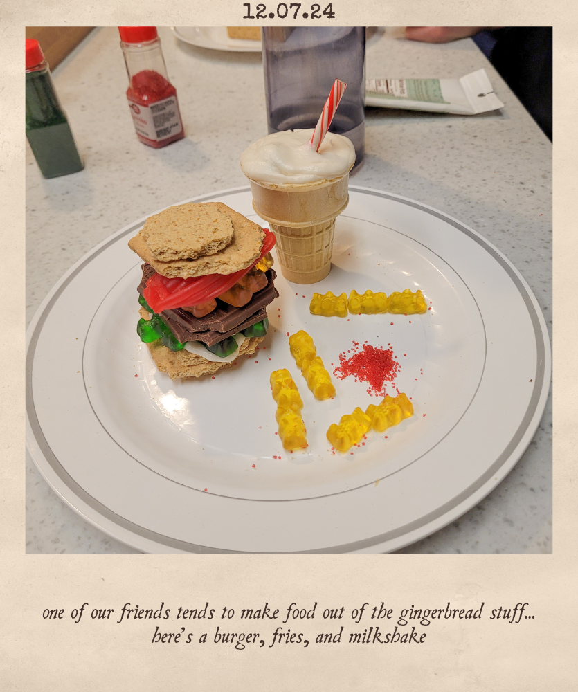 For the third year now, I’ve hosted a “holiday hodgepodge” that I call, Friendsgivingmas. We had a great number of people, but nearly everyone was about an hour late 😅 We had some of my dad’s soups, cheesy broccoli casserole, roasted cauliflower, and a bunch of other stuff (mostly desserts and alcohol lol) that everyone else brought! There weren’t as many gingerbread houses as usual, and I was not a fan of mine, but it was all fun to be there, anyway! I absolutely love hosting this party year after year!