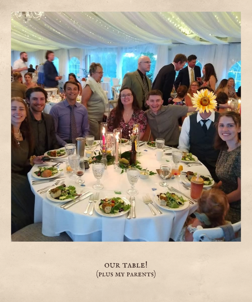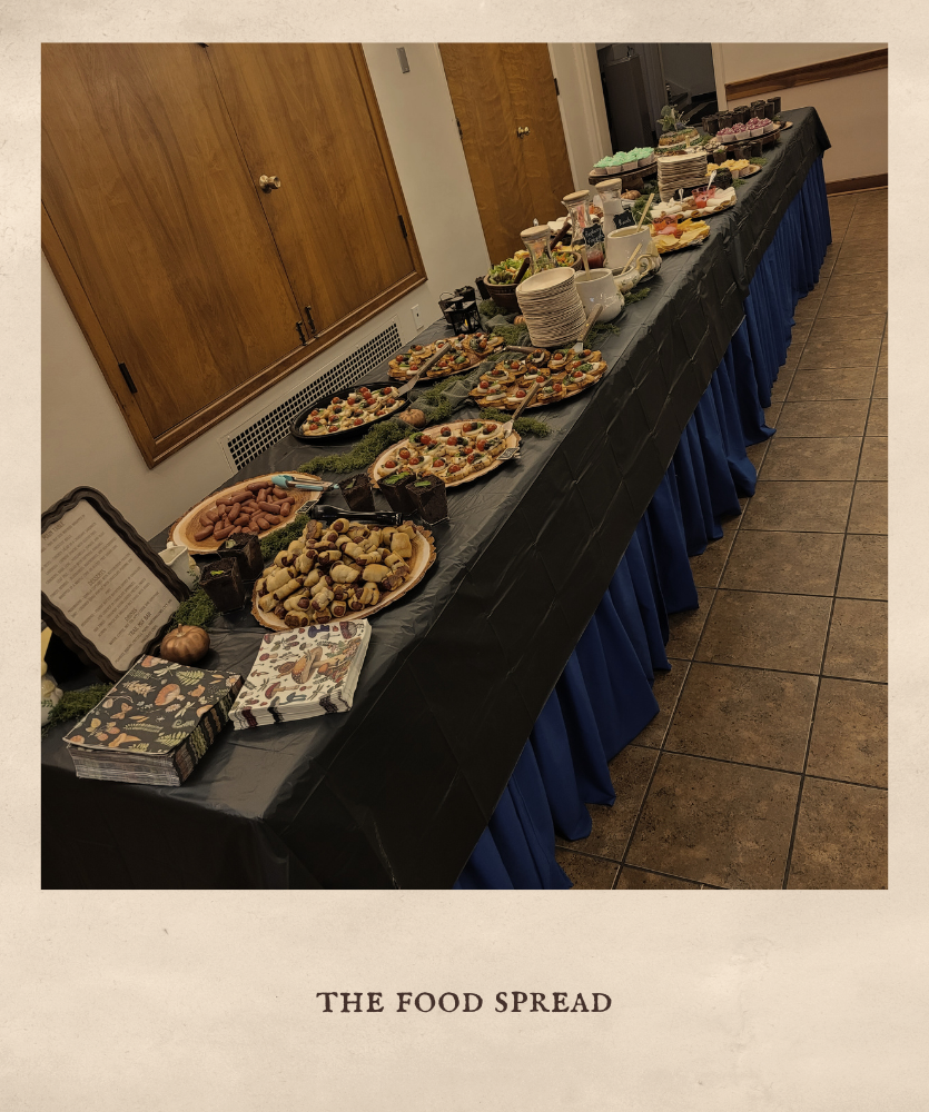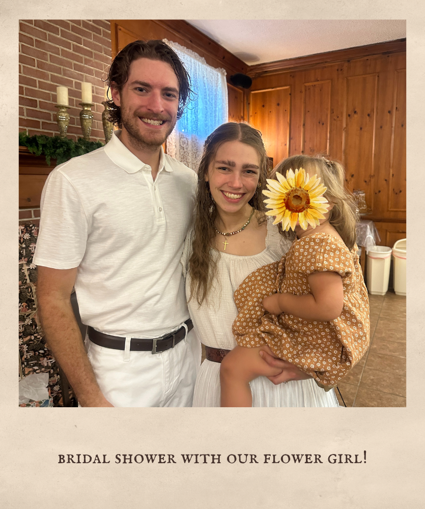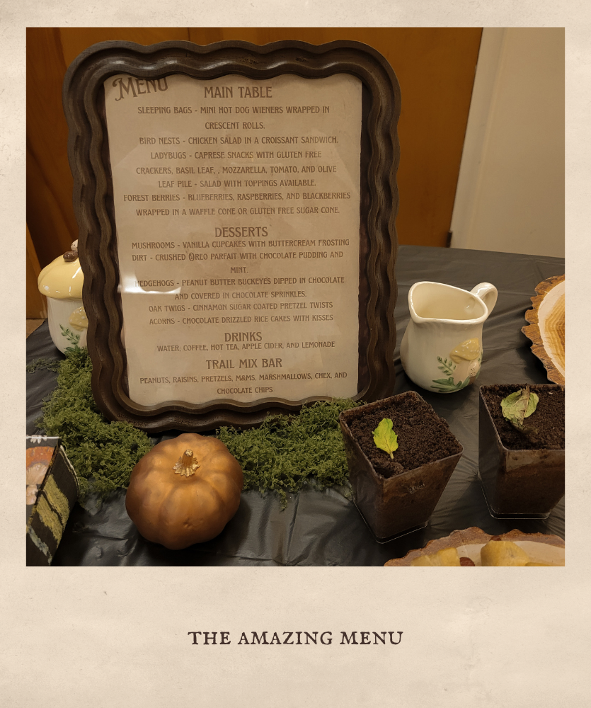 My bridal shower was held about a month before the wedding, and I left pretty much all of it up to my older sister, Emma, who was my Matron of Honor! It was Enchanted Forest themed, and she absolutely killed it! Even the food was themed (see picture of menu down below), with snacks called, “hedgehogs,” “ladybugs on a flower,” and “mushrooms.” My younger sister, Briana, made the cake, and I don’t think I will ever get over how amazing it was! It was such a wonderful time of fellowship, gifts, and fun!